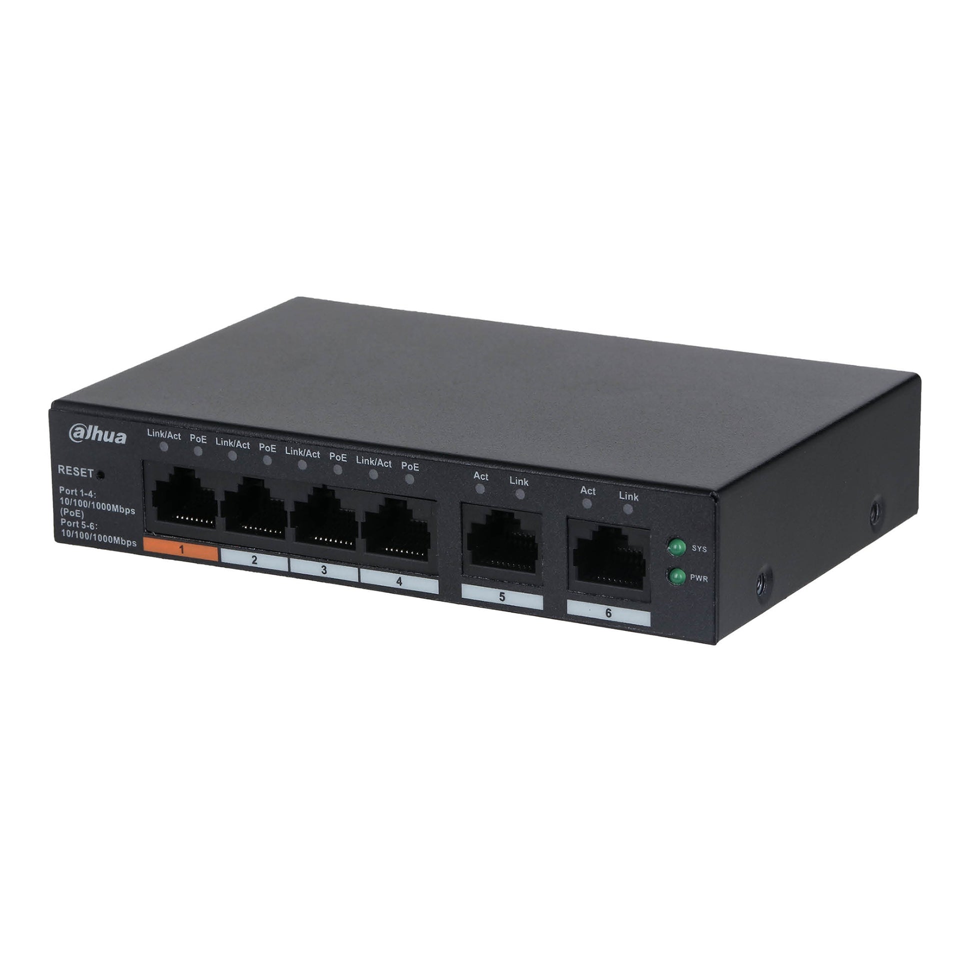Dahua 4 Port Layer 2 Managed Gigabit Switch, Cloud Management via Dolynk, 4 x 10/100/1000 PoE+ (1 x High PoE), max 60W, 2 x Gigabit Uplink Ports, 53Vdc PSU
